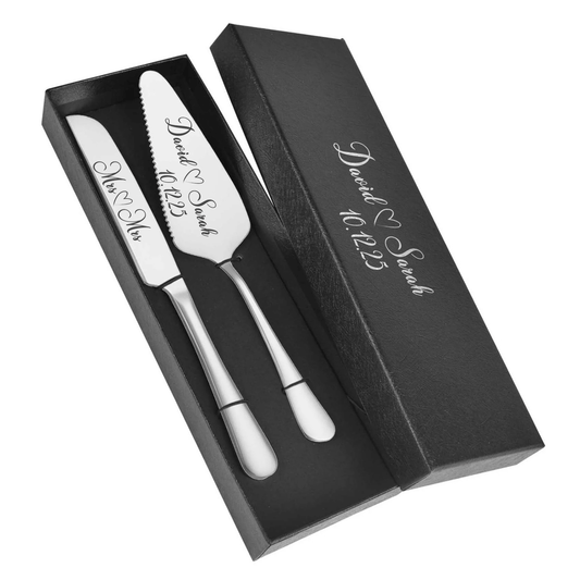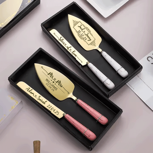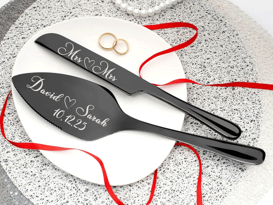 Custom Wedding Cake Server and Slicer Knife Gift Set Personalised for Bride & Groom made of Stainless Steel (Black , Silver , Gold , Rose Gold)