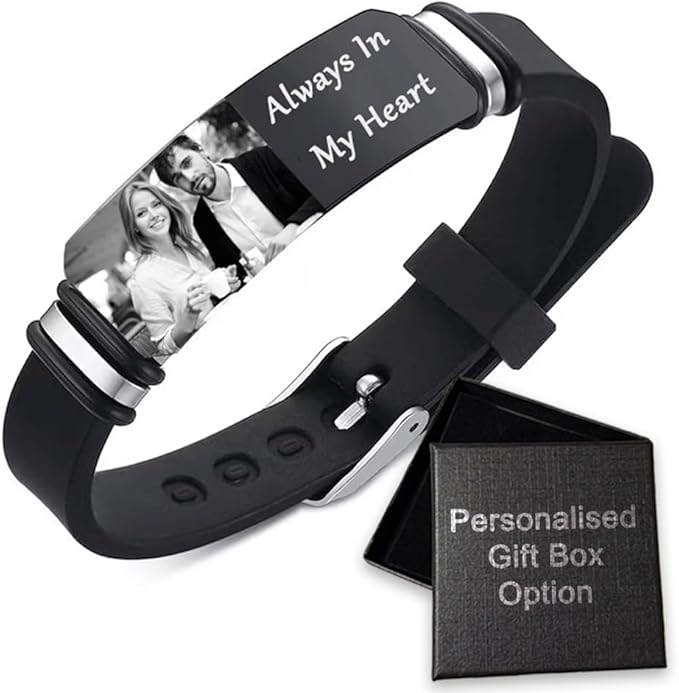 - Custom Photo Bracelet – Personalise this black bracelet with your favourite photo and custom text. Comes with a branded gift box, creating a unique keepsake for loved ones